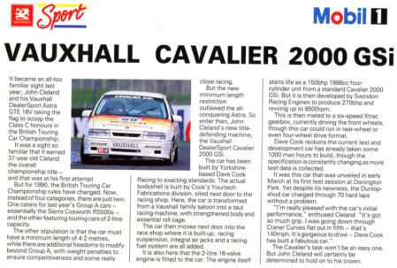 - 1991: The BTCC adopted the new 2.0-litre Super Touring regulations. Cleland was joined by Jeff Allam and for a couple of rounds, again by Bob Berridge. The Cavalier adapted well, and Cleland finished second overall, narrowly missing out on the title to BMW’s Will Hoy. The car’s balance and reliability began to shine through.